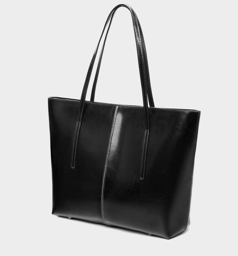 This black calfskin tote bag has four rivets at the bottom to support balance.