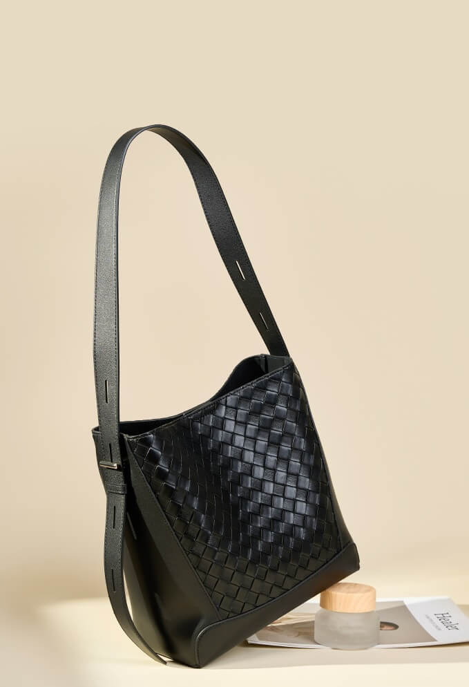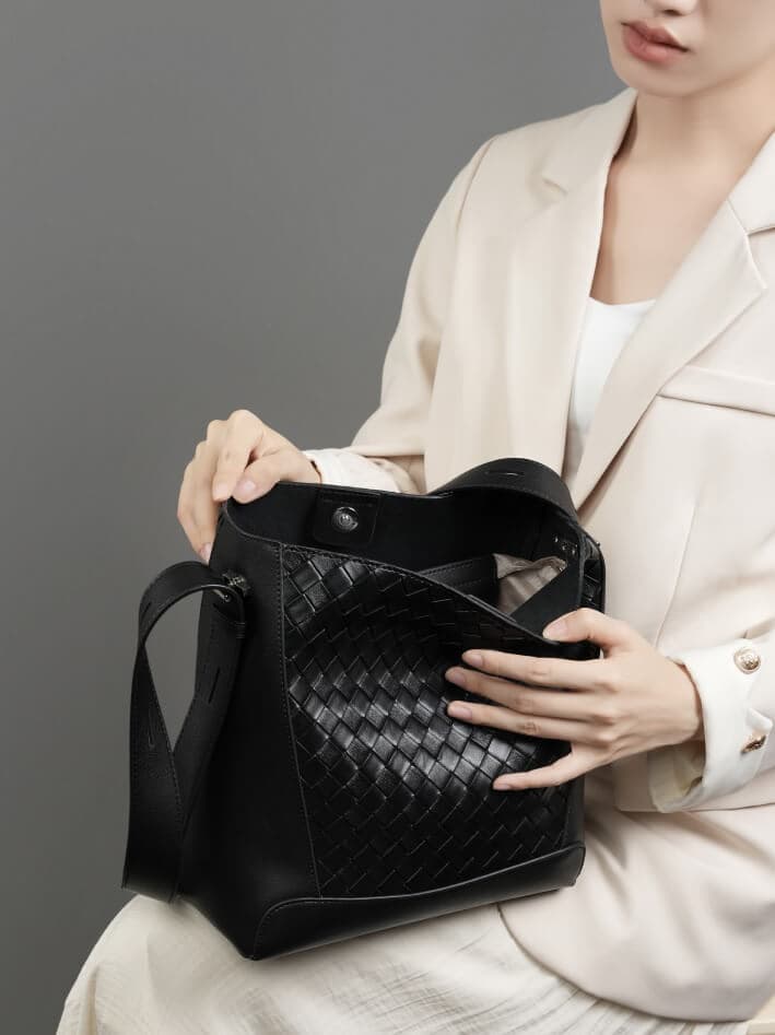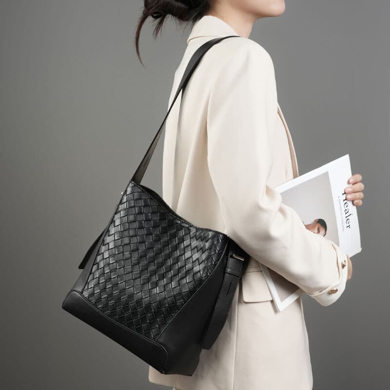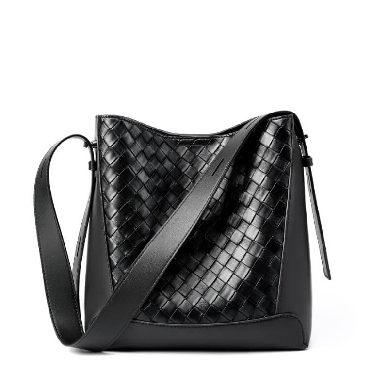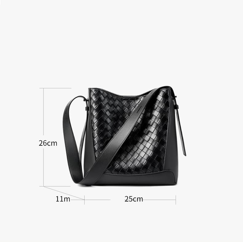 Classic Big Capacity Black Cowhide Hand Woven Crossbody Bags