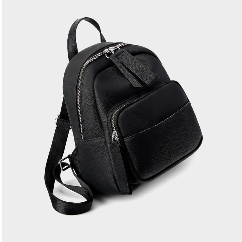 There is a zipper bag on the behind of this black backpack.