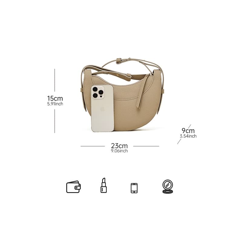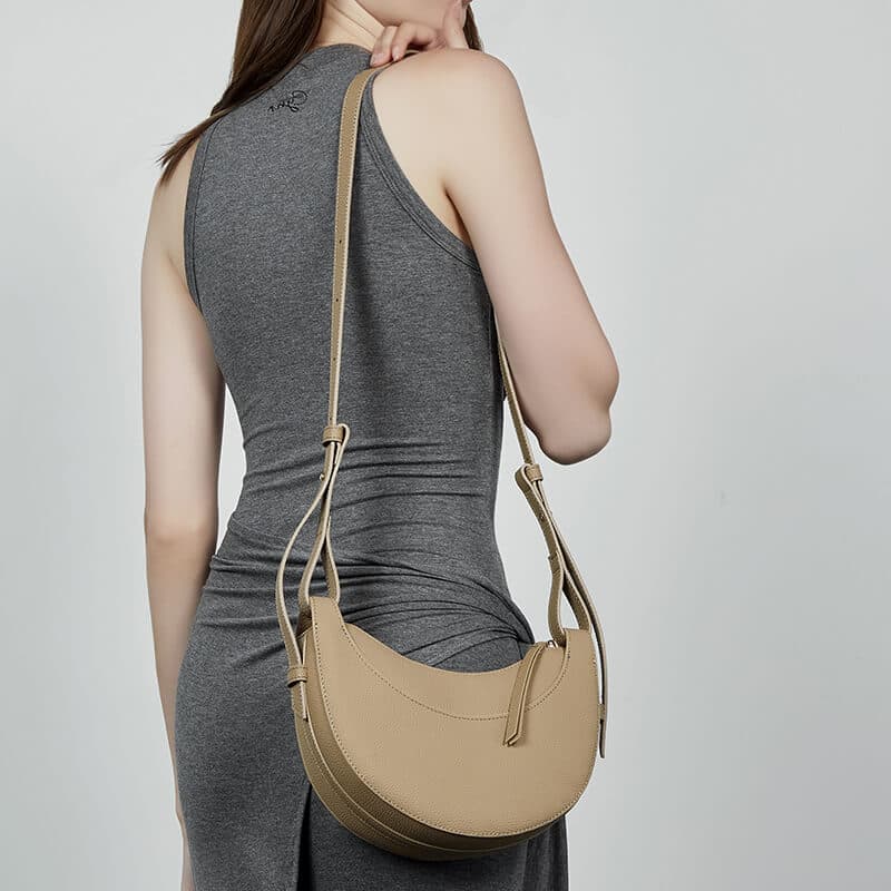 This Fashionable Khaki Cow Leather Crescent Saddle Crossbody Bag combines timeless style with modern functionality.