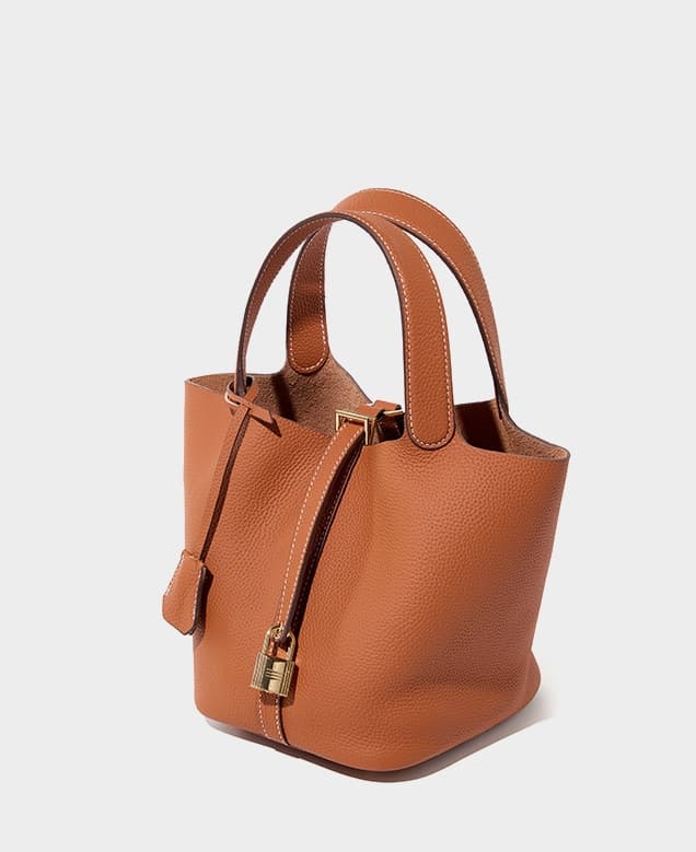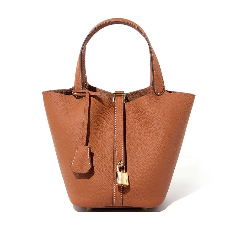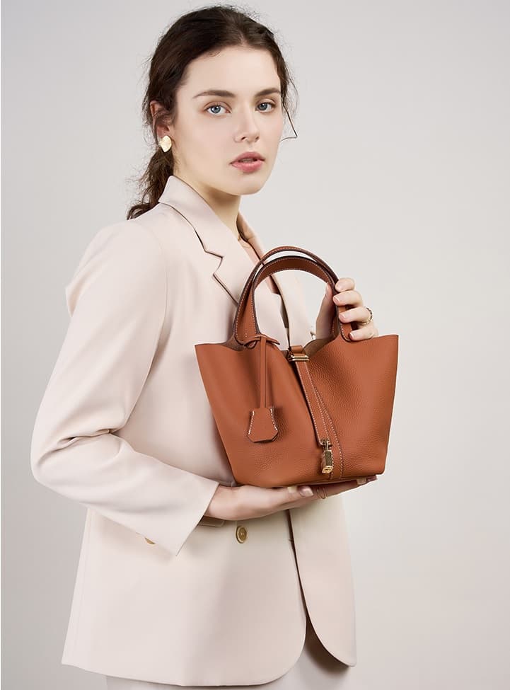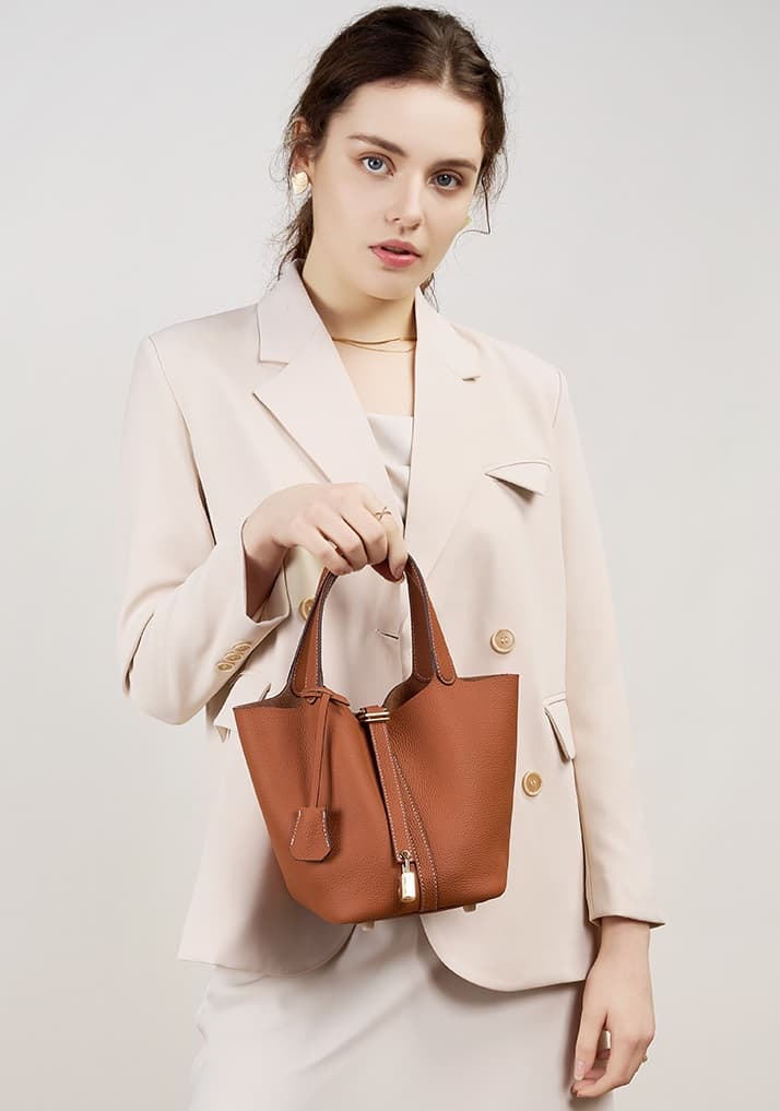 High-Quality Brown Litchi Textured Cow Leather Basket Bucket Bags