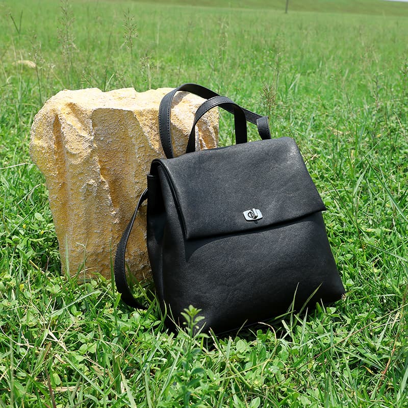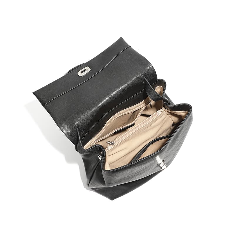 This style black bacpack is openning and close by the silver rotating lock buckle with the leather flap.