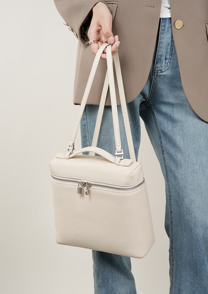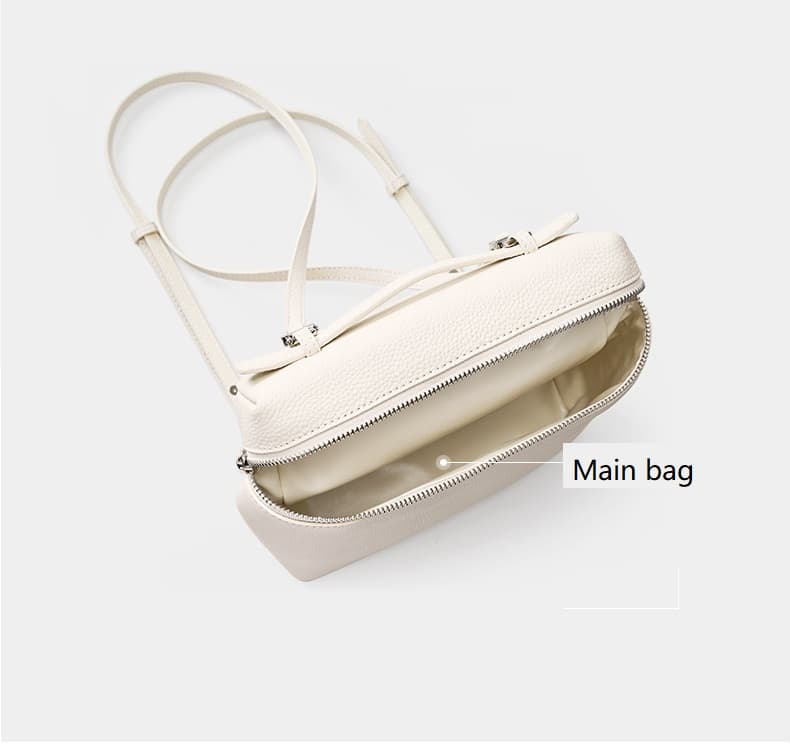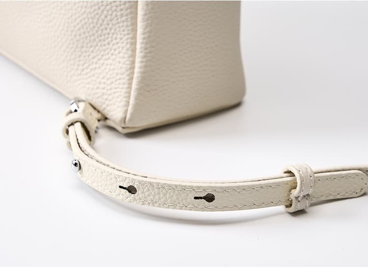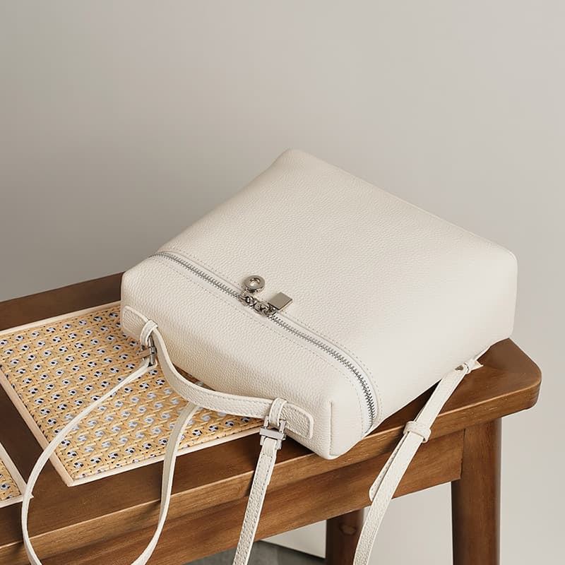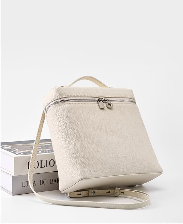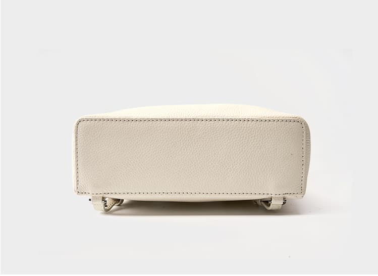 Crafted from durable full-grain cow leather, this stylish backpack features a soft off-white hue that complements any outfit.