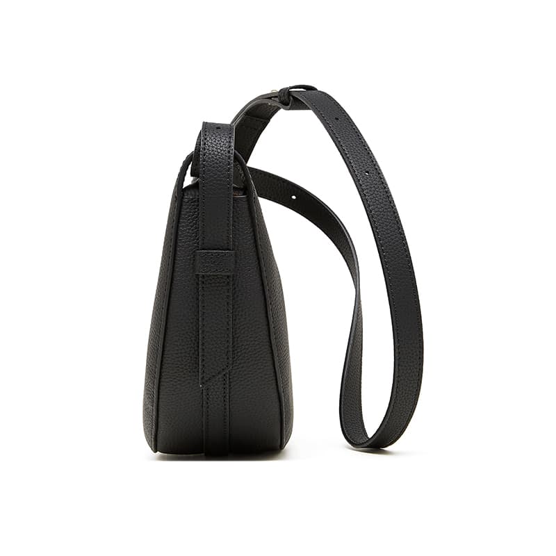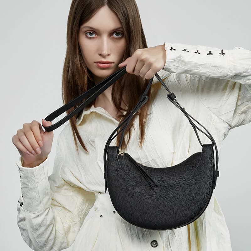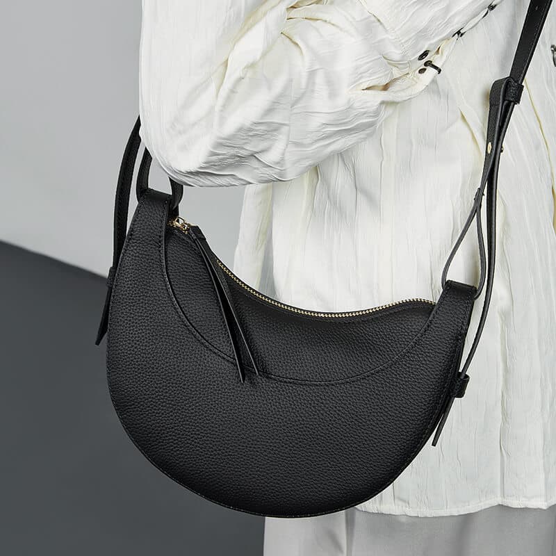 Crafted from premium black leather, its sleek crescent shape and minimalist design make it a versatile addition to any wardrobe.