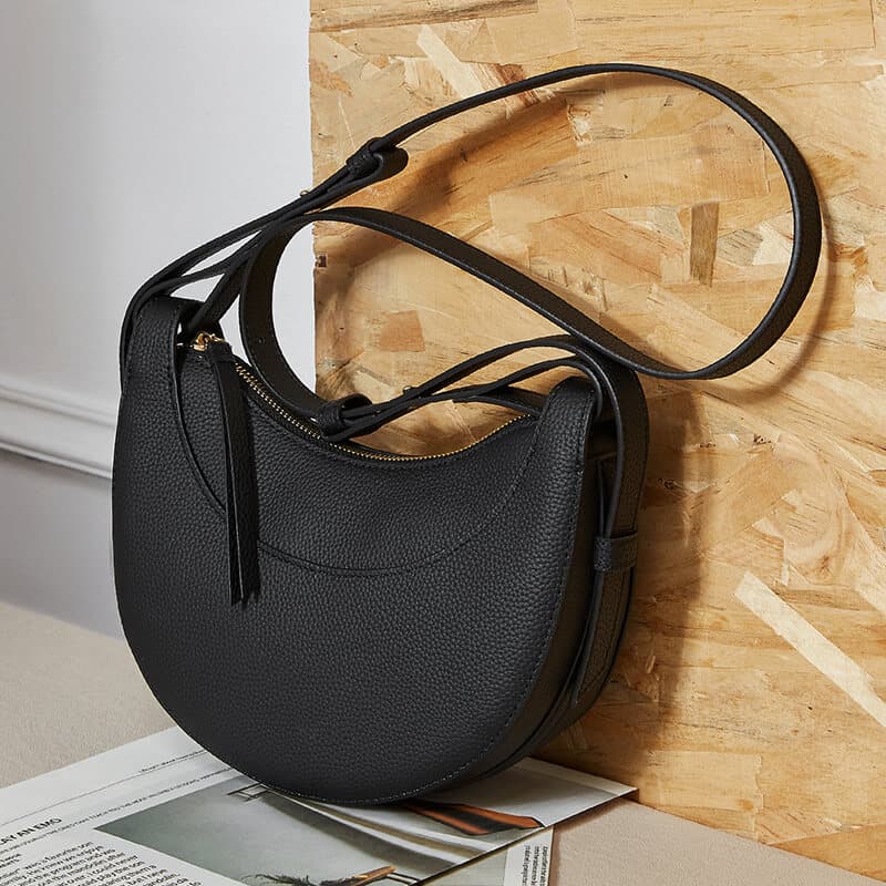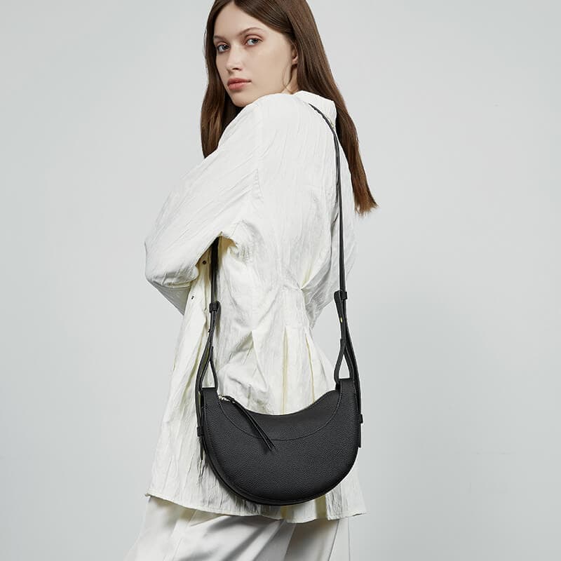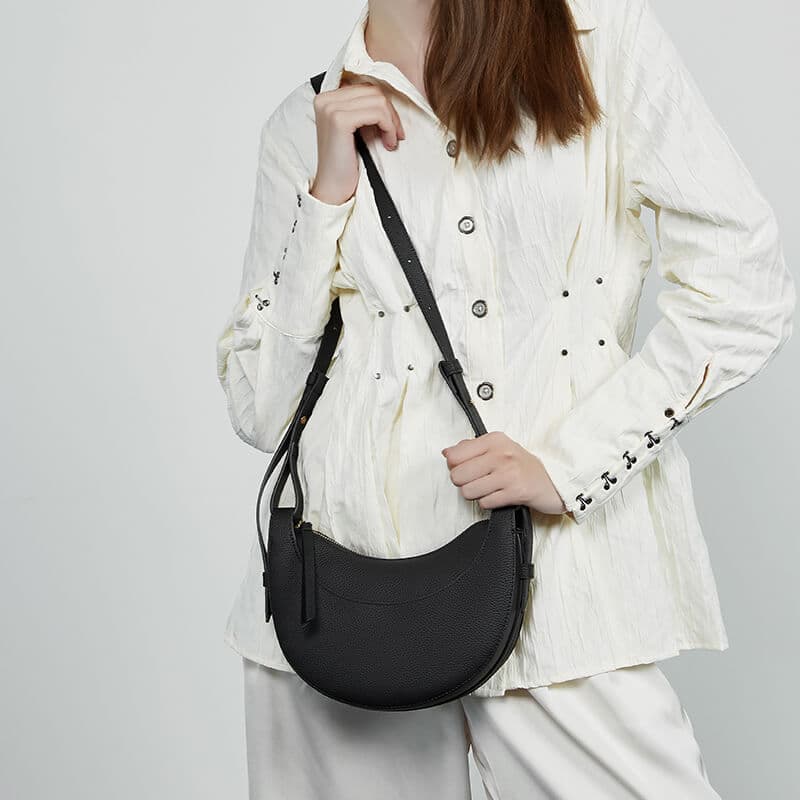 & Free ShippingCrafted from premium real leather, this minimalist crescent-shaped crossbody bag combines elegance with functionality. Its smooth black finish and sleek saddle design make it a versatile accessory for any occasion. The adjustable strap ensures a comfortable fit, while the compact size offers just enough space for essentials. Perfect for day-to-night transitions, it’s a timeless piece for the modern wardrobe.