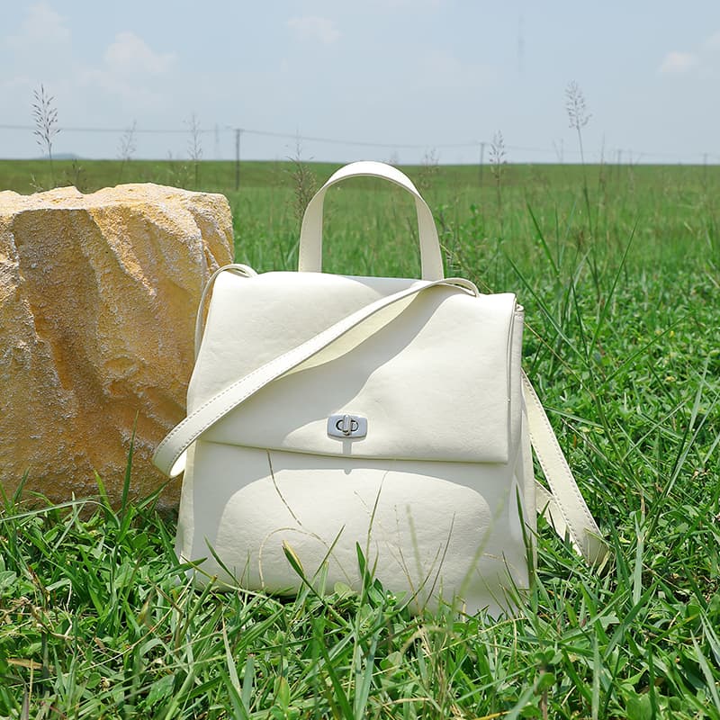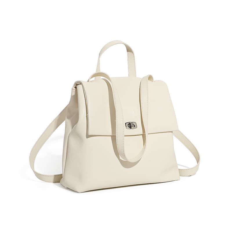 This style white bacpack is openning and close by the silver rotating lock buckle with the leather flap.